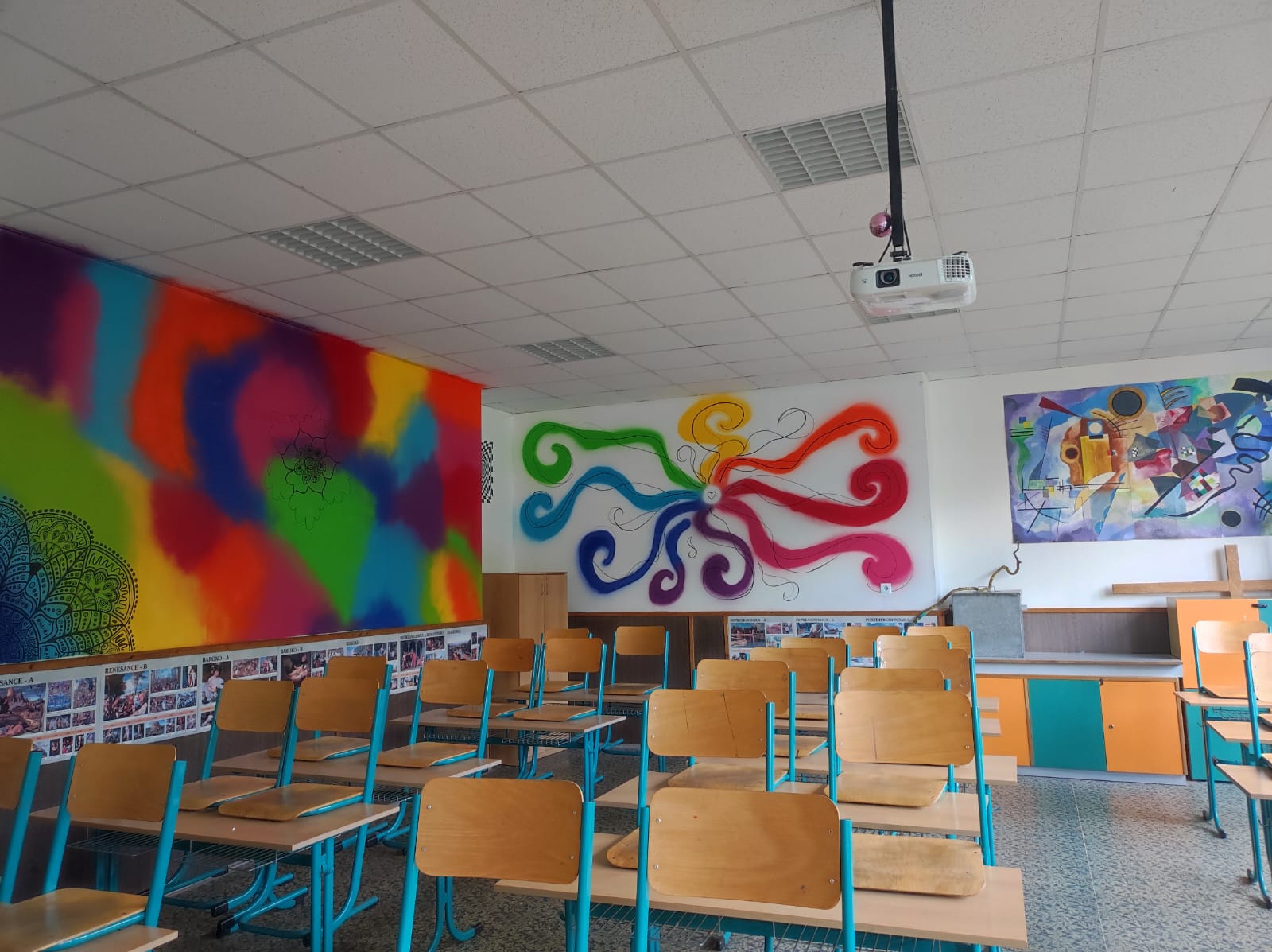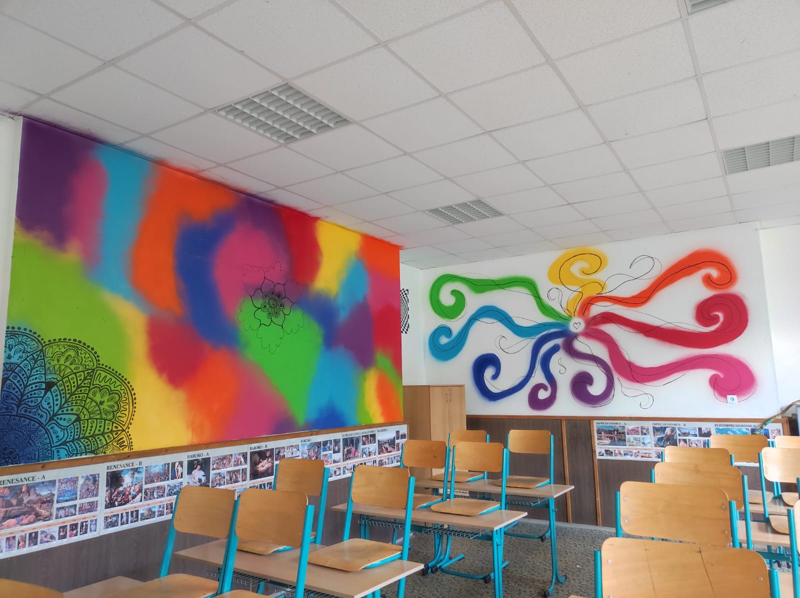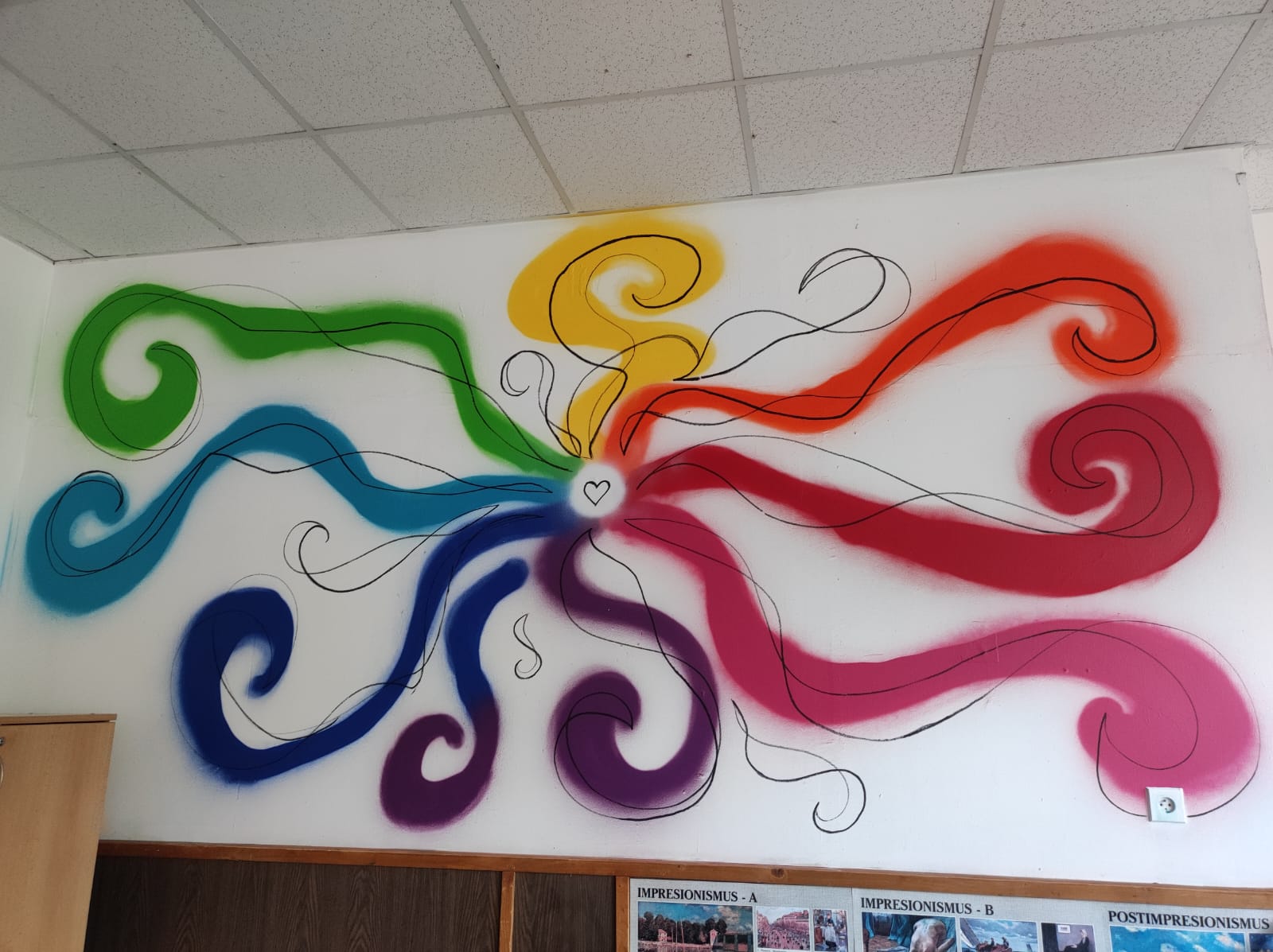 Minulý rok si letošní tercie sama vyzdobila svou kmenovou třídu podle návrhu Julie Kulhánkové, a díky tomu v ní vznikla útulná a příjemná atmosféra. Letos se podobná myšlenka objevila i v učebně výtvarné výchovy, kterou třída sekunda opustila. Brzy se začaly objevovat návrhy na vyzdobení. Nakoupily se spreje, fixy a mohlo se začít s úpravami. Jedna plnobarevná stěna s mandalami působí klidně, ale přesto vesele, zatímco druhá stěna zobrazuje roztančenou duši a srdce. Nyní je učebna plná života, lásky a štěstí, ale zároveň se v ní nádherně soustředí a nejlépe se tam samozřejmě maluje. Dívky, které na tomto projektu pracovaly, jsou rády, že po nich na gymnáziu něco zůstane a že mohly učebnu takto rozzářit.