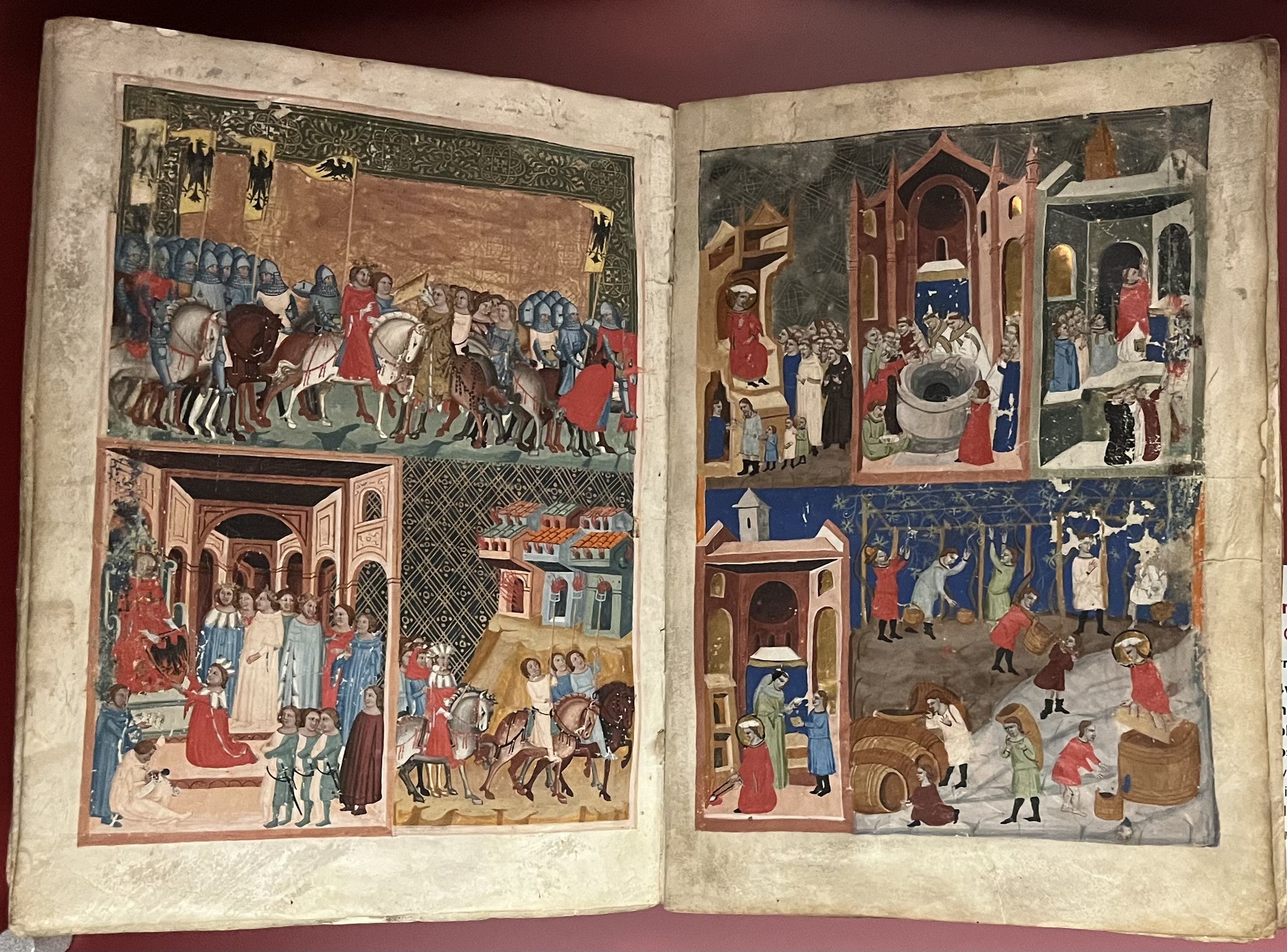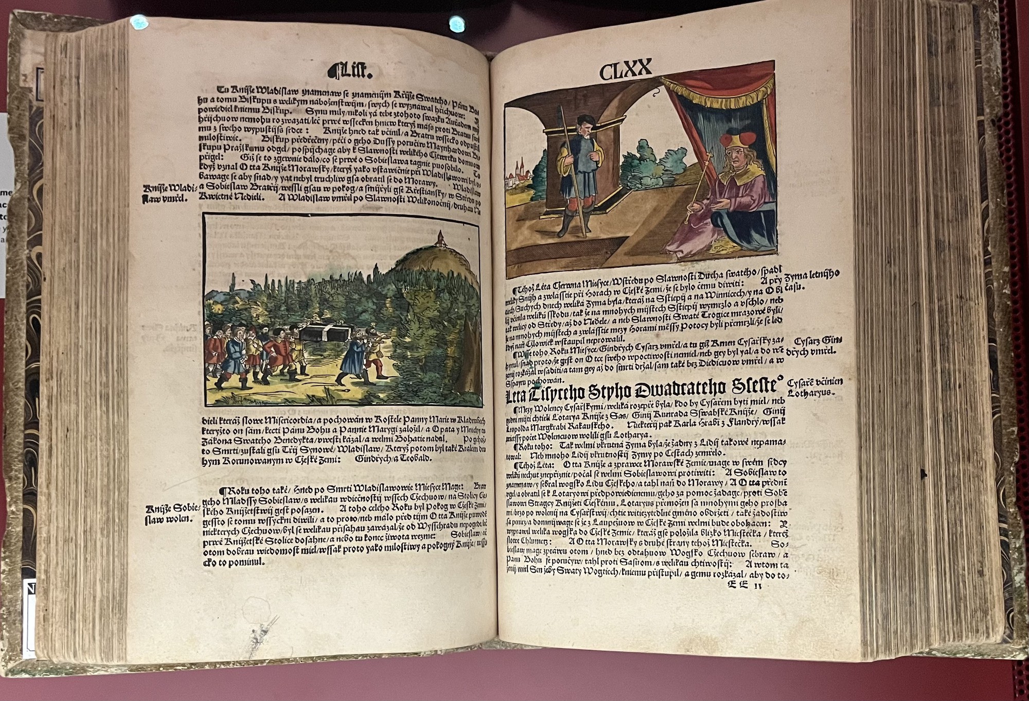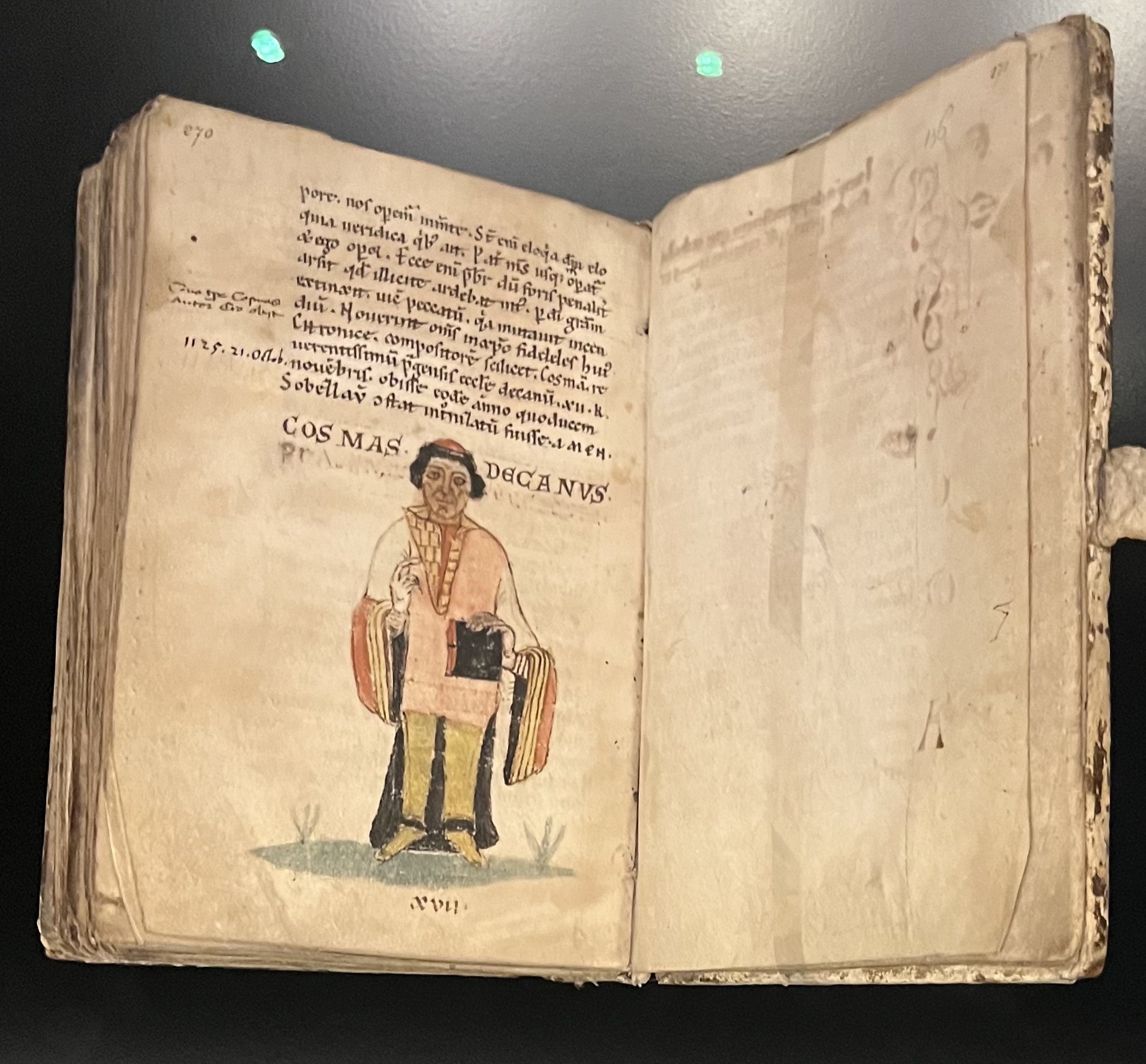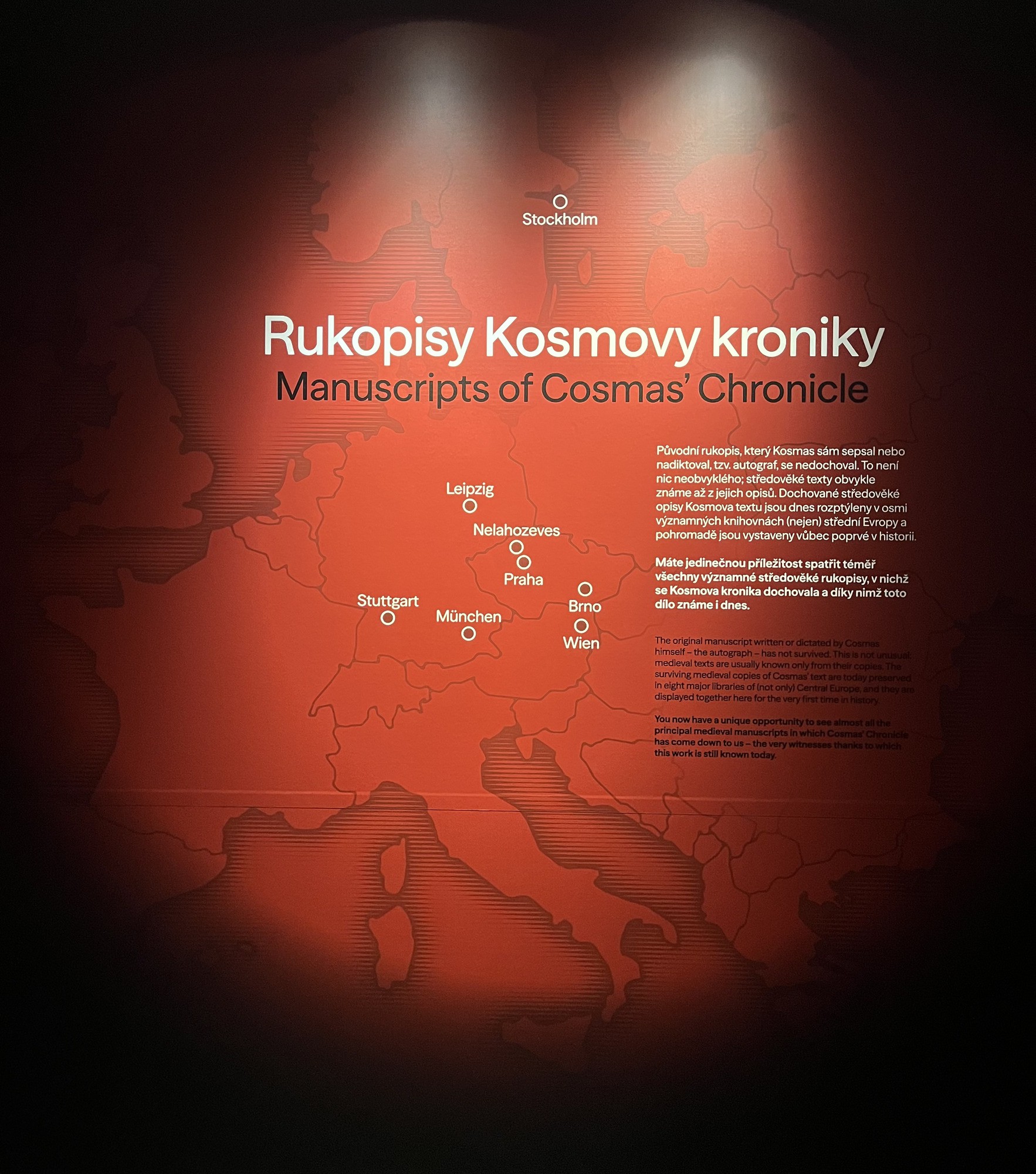 První hlavní zastávkou bylo Klementinum, kde v barokní Zrcadlové kapli probíhá výstava Kosmas 900. Žáci zde měli možnost zhlédnout řadu vzácných rukopisů vztahujících se k českým dějinám – například Lipský rukopis s podobiznou Kosmy, faksimile Codexu gigas, Dalimilovu kroniku či Kroniku českou od Václava Hájka z Libočan. U posledně jmenovaného díla projevili někteří žáci výborné paleografické schopnosti a dokázali přečíst úryvek o nástupu knížete Soběslava I. Během celé návštěvy měli navíc k dispozici i výtisk Kosmovy kroniky v překladu prof. Marie Bláhové.