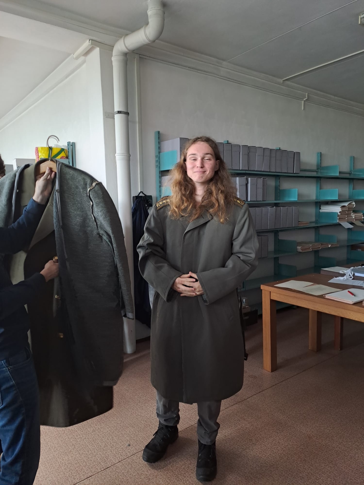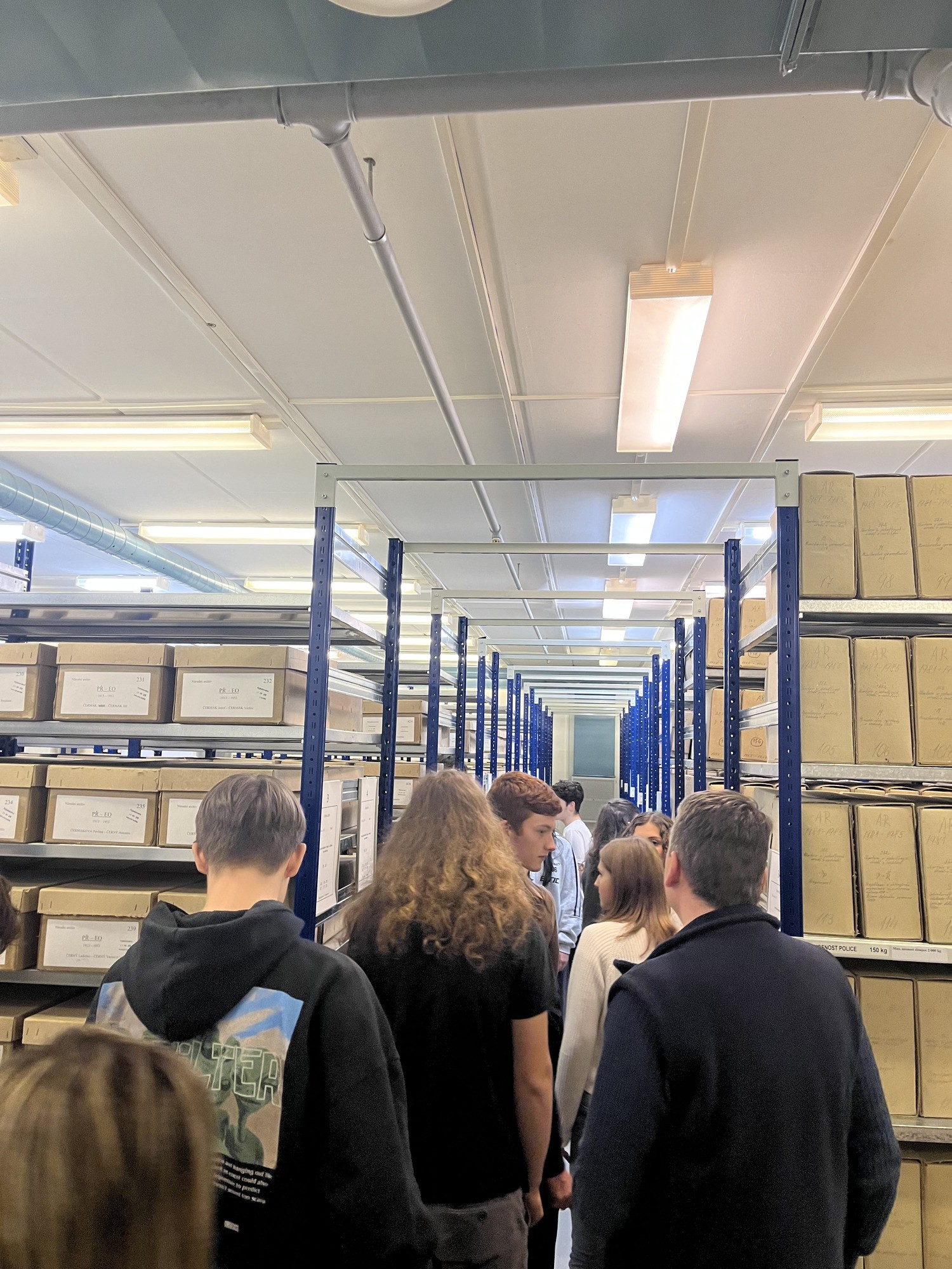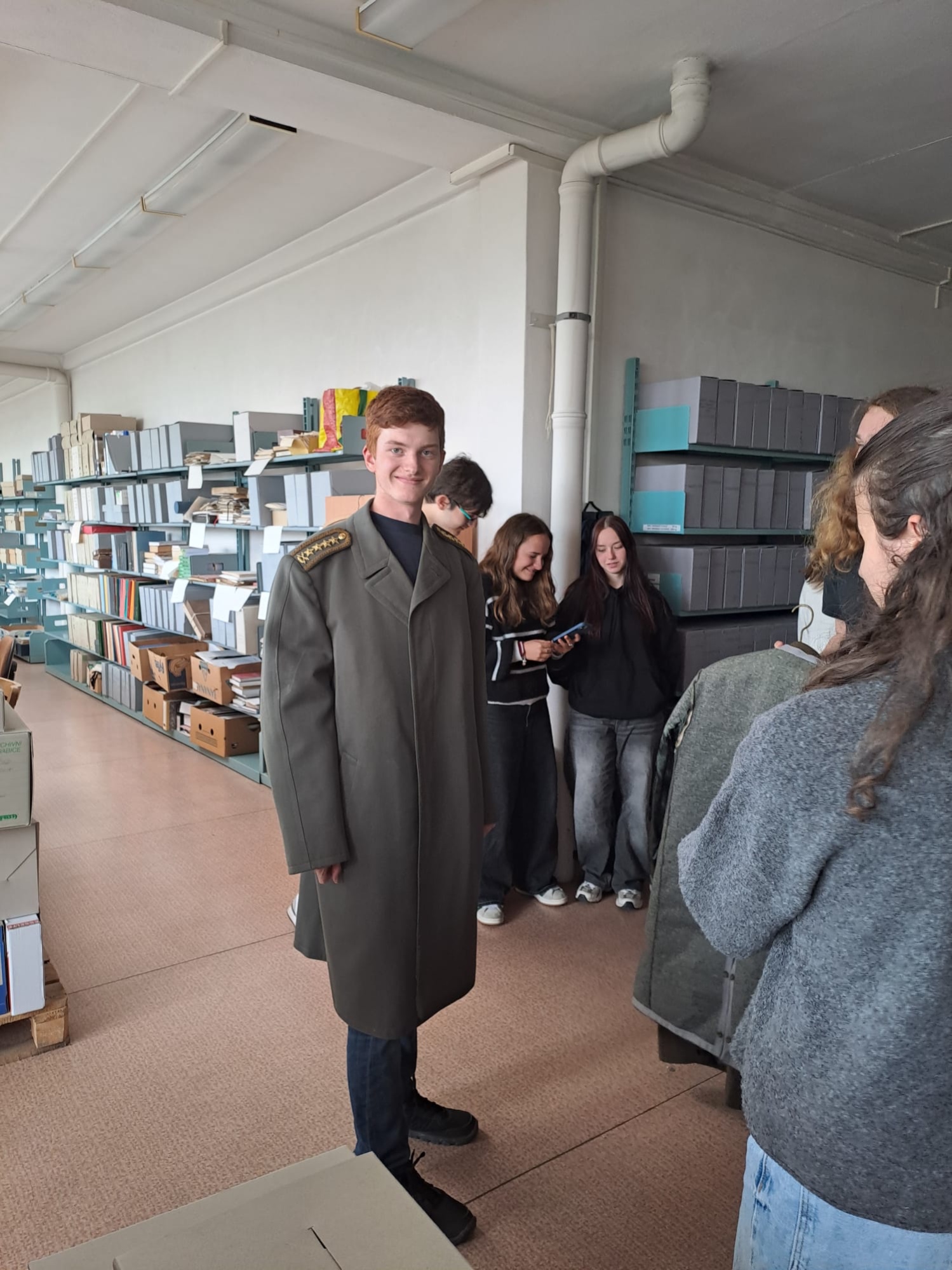 Následovala prohlídka samotného zázemí Národního archivu. Žáci prošli trasu, kterou běžně absolvují archiválie – od vykládací rampy přes místnosti určené k jejich zpracování a třídění až po archivní fondy. Zde si mohli vyzkoušet například originální vojenský oděv generála Ludvíka Svobody, který byl do archivu nedávno zařazen. Poté se program přesunul k části věnované Policejnímu ředitelství. Pan Kouřimský vysvětlil, proč je tato agenda důležitá pro začínající badatele (především v oblasti genealogie). Žáci si sami vyhledávali vybrané archiválie a objevili například bytovou přihlášku Julia Fučíka s datem popravy, záznamy o Janu Werichovi. Panem Kouřimským nám byly ukázány materiály materiály Milady Horákové a rodiny Arnošta Lustiga. U posledně jmenovaného žáci poznali, jakým způsobem probíhala v období nacistické perzekuce diferenciace společnosti.
