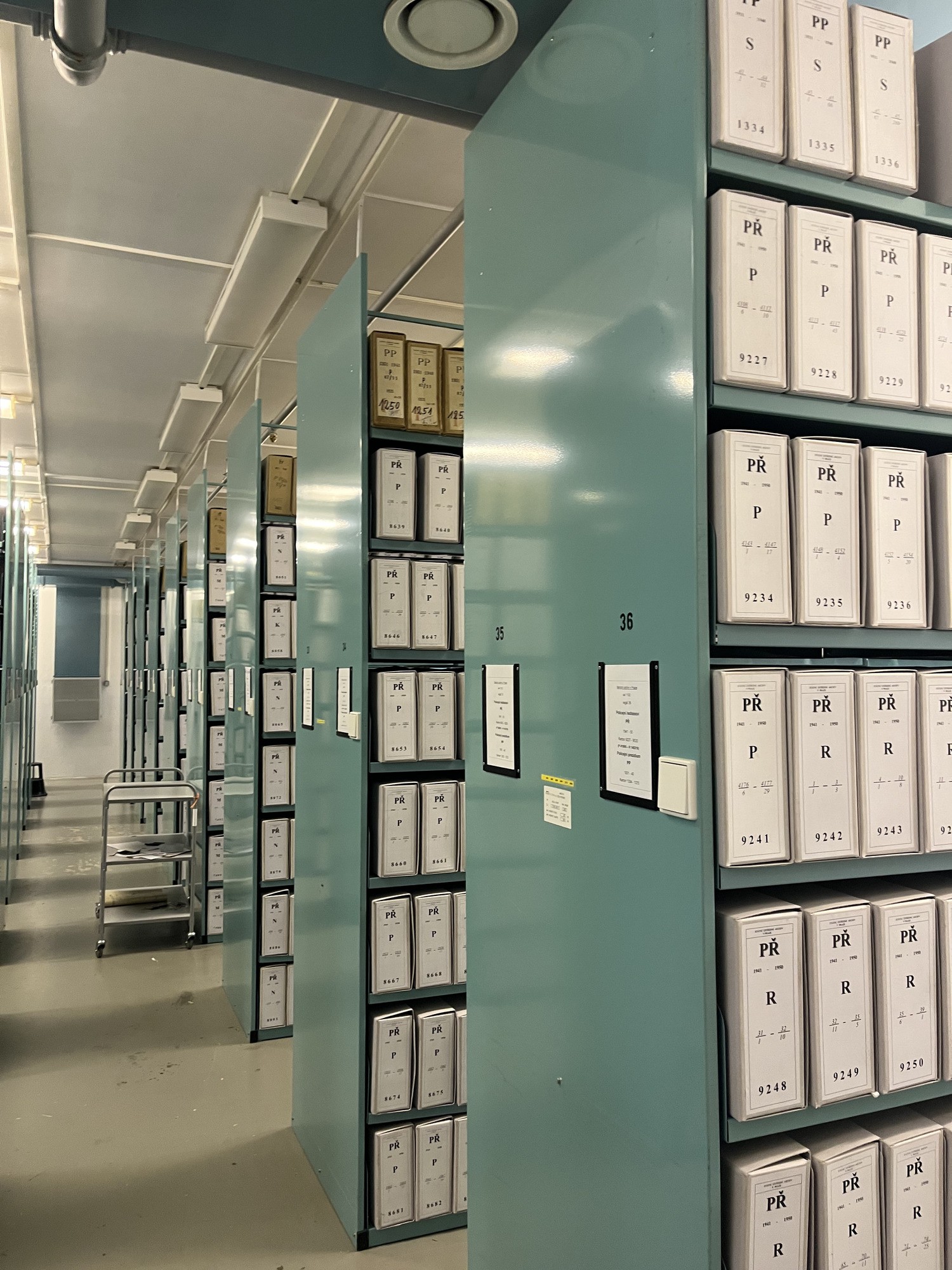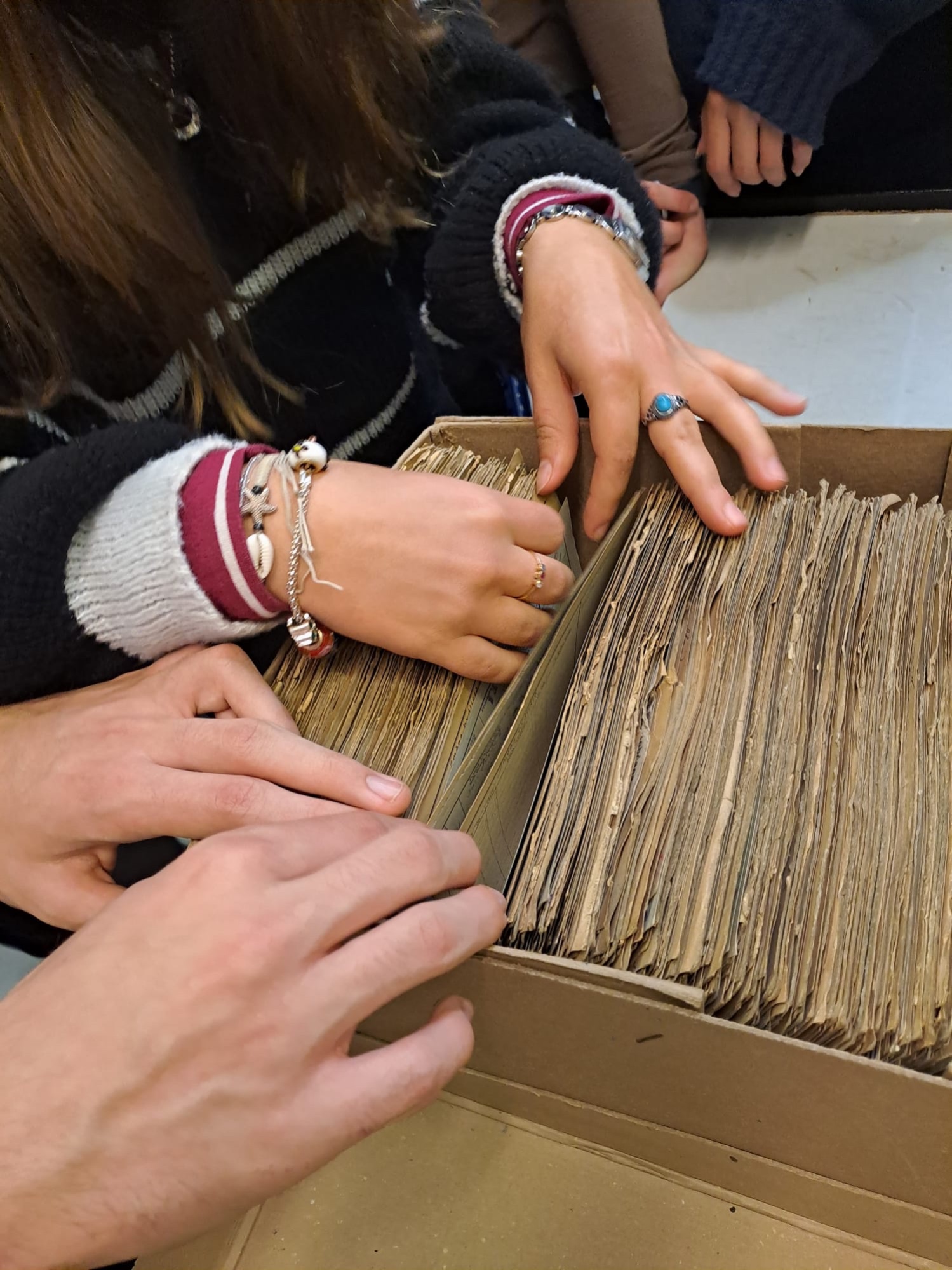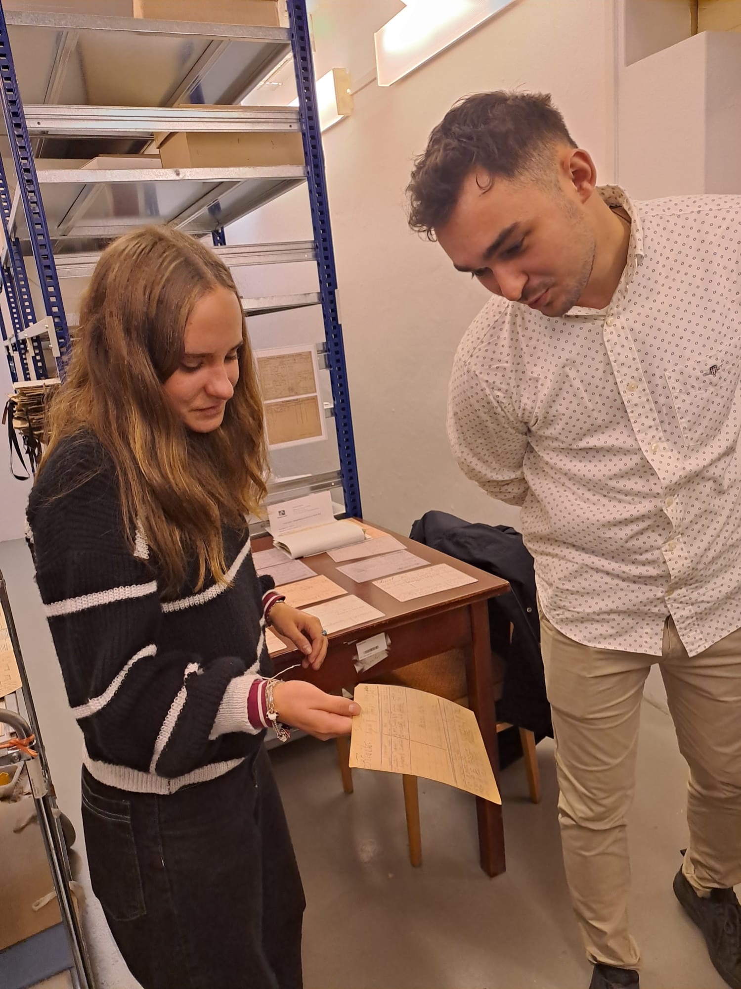 Následovala prohlídka samotného zázemí Národního archivu. Žáci prošli trasu, kterou běžně absolvují archiválie – od vykládací rampy přes místnosti určené k jejich zpracování a třídění až po archivní fondy. Zde si mohli vyzkoušet například originální vojenský oděv generála Ludvíka Svobody, který byl do archivu nedávno zařazen. Poté se program přesunul k části věnované Policejnímu ředitelství. Pan Kouřimský vysvětlil, proč je tato agenda důležitá pro začínající badatele (především v oblasti genealogie). Žáci si sami vyhledávali vybrané archiválie a objevili například bytovou přihlášku Julia Fučíka s datem popravy, záznamy o Janu Werichovi. Panem Kouřimským nám byly ukázány materiály materiály Milady Horákové a rodiny Arnošta Lustiga. U posledně jmenovaného žáci poznali, jakým způsobem probíhala v období nacistické perzekuce diferenciace společnosti.