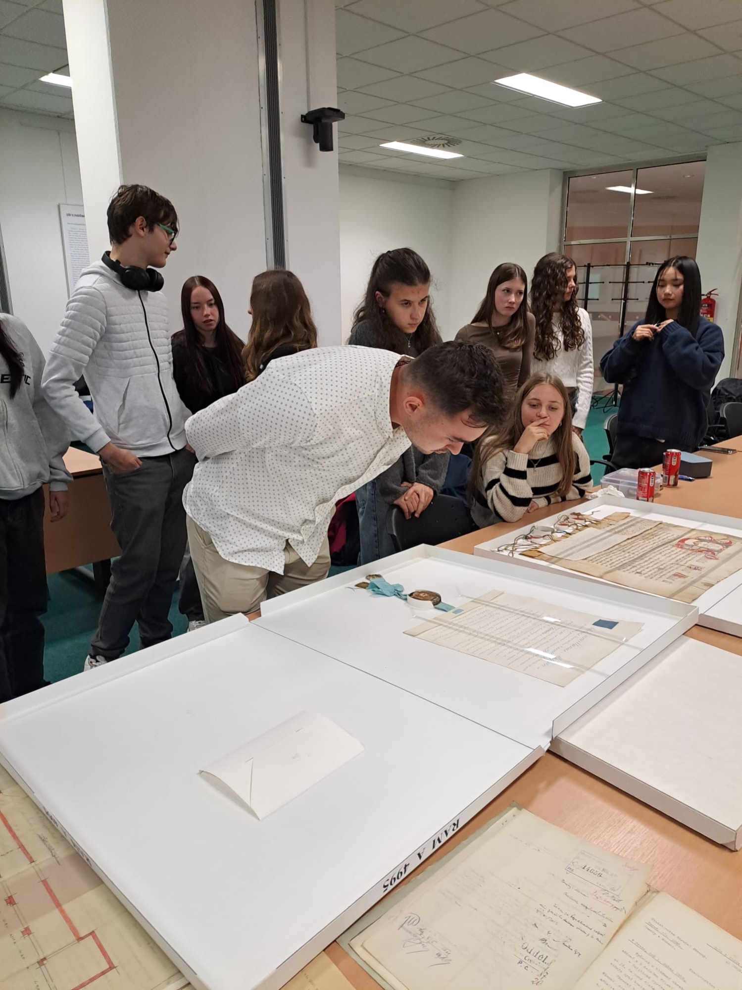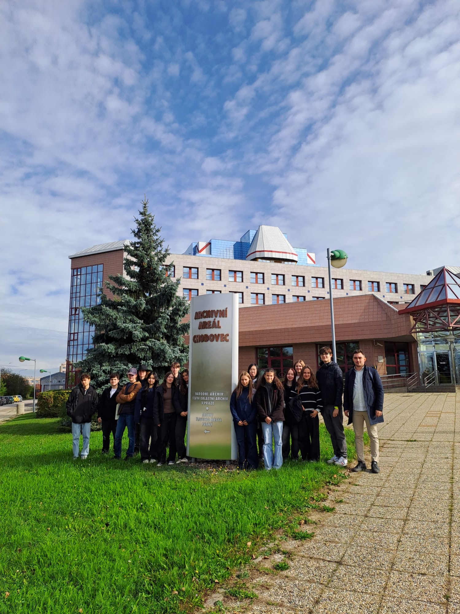 Další část exkurze směřovala na pražský Chodovec, kde od počátku 21. století sídlí Národní archiv. Tady se žáků ujali archiváři dr. Jan Kahuda a Mgr. Jan Kouřimský. Nejprve představili úlohu archivu ve společensko-kulturním kontextu a poté žákům ukázali vybrané archiválie. Žáci měli možnost shlédnout dokumenty týkající se města Mimoň (plány nádraží, výnosy o útěku nacistů v roce 1945, pamětní knihu městského úřadu). Dále jim byly představeny staré listiny – mimo jiné s majestátní pečetí Karla IV., čestný doktorát z Oxfordu pro knížete Metternicha či originální rukopisy George Washingtona, Giacoma Casanovy a Ludwiga van Beethovena, a také znění Mnichovské dohody.