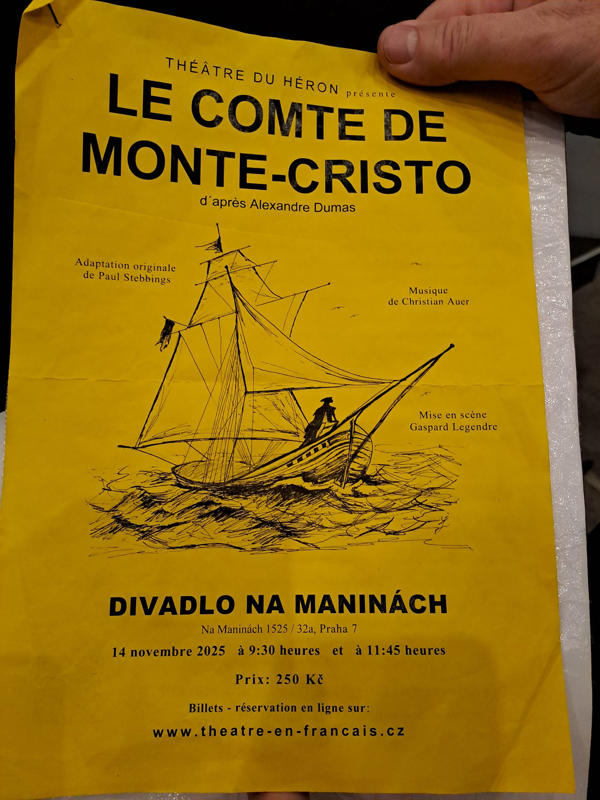 Dne 14.11. 2025 se skupiny ze tříd sekunda, tercie a septima v rámci výuky francouzského jazyka vydaly na divadelní představení Hrabě Monte Cristo do Divadla Na Maninách v Praze. Jednotlivé postavy z pera spisovatele Alexandra Dumase staršího uvedli do života členové divadelní skupiny Théâtre du Héron, která přináší nejikoničtější díla francouzské literatury na pódia zahraničních divadel v originálním znění. Hrabě Monte Cristo v podání divadelní skupiny Théâtre du Héron uchvátil publikum nejenom svým podáním a interpretací, ale i souhrou různých efektů a písní, které nás doprovázely po dobu celého představení. Unikátní zážitek jsme si mohli vychutnat ze sedadel první a druhé řady – výsada, kterou pro nás zařídil pan učitel Boyon. Představení bylo součástí projektu Théâtre en français, jehož cílem je ozvláštnění výuky francouzského jazyka a prohloubení znalostí o francouzské literatuře mezi žáky z různých evropských zemí. Součástí představení byla i krátká beseda s herci ve francouzštině, během které nám bylo nastíněno fungování celého projektu a jeho další směřování. Z divadla jsme odcházeli plni dojmů a nové slovní zásoby, kterou můžeme využít v hodinách francouzského jazyka.