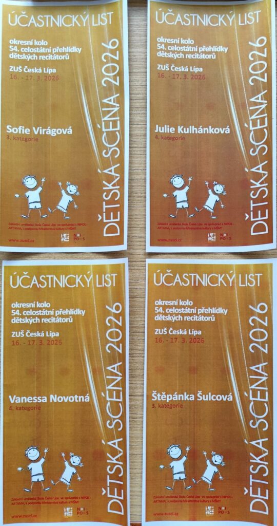 V úterý 17. 3. 2026 se v České Lípě konala přehlídka dětských recitátorů, na kterou ze školního kola postoupily Sofie Virágová (prima) se Štěpánkou Šulcovou (prima) v nižší kategorii a Julie Kulhánková (tercie) s Vanessou Novotnou (kvarta) v kategorii vyšší. Každý rok je na této přehlídce velká konkurence a ani letos tomu nebylo jinak. Přestože tentokrát recitátorky do krajské přehlídky nepostupují, získaly účastnické listy a další zkušenosti, které mohou využít v příštím ročníku, kterého se opět rádi zúčastníme.
