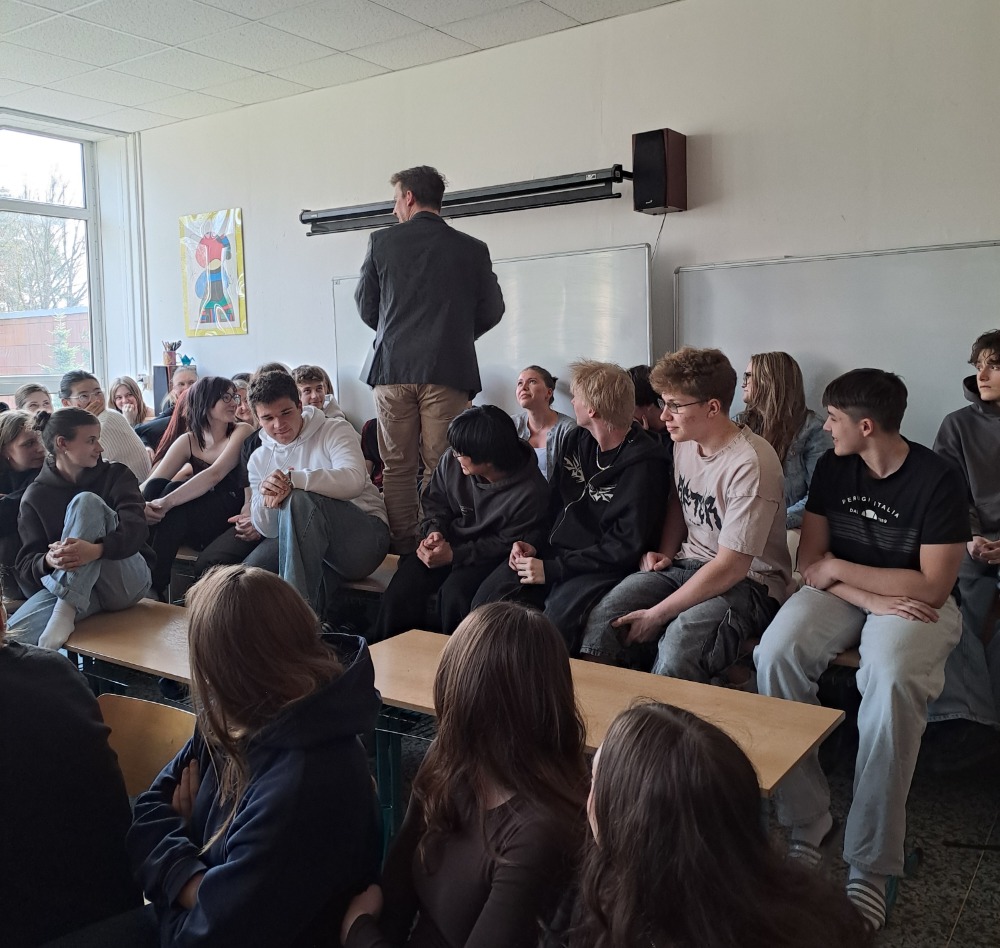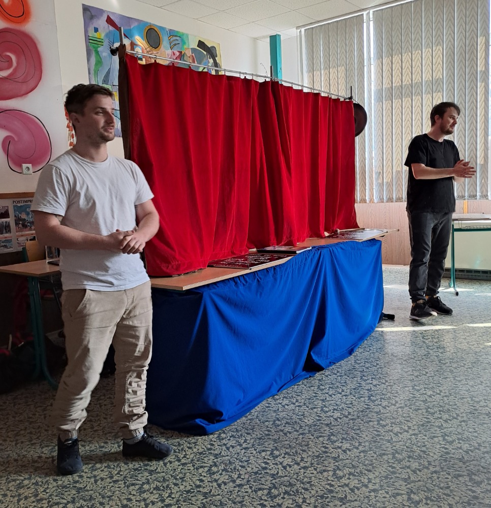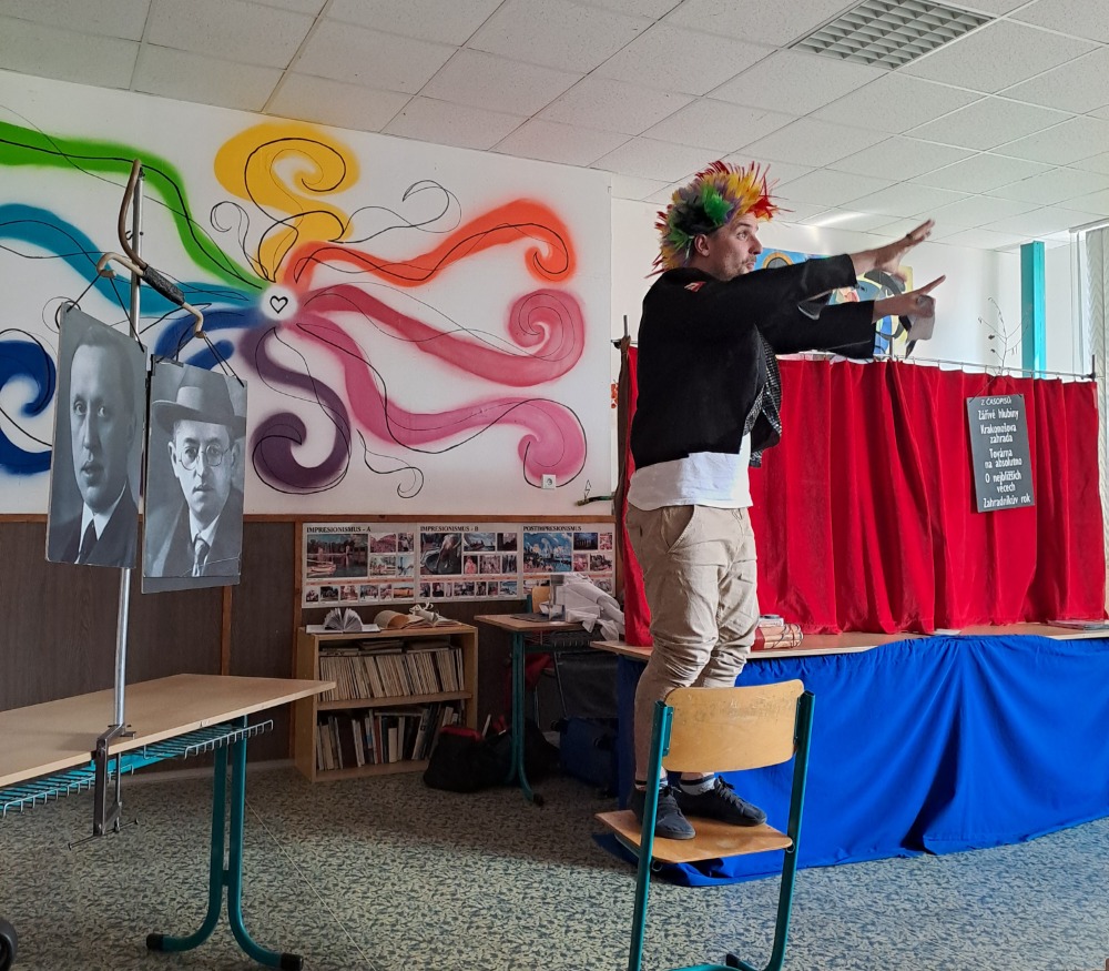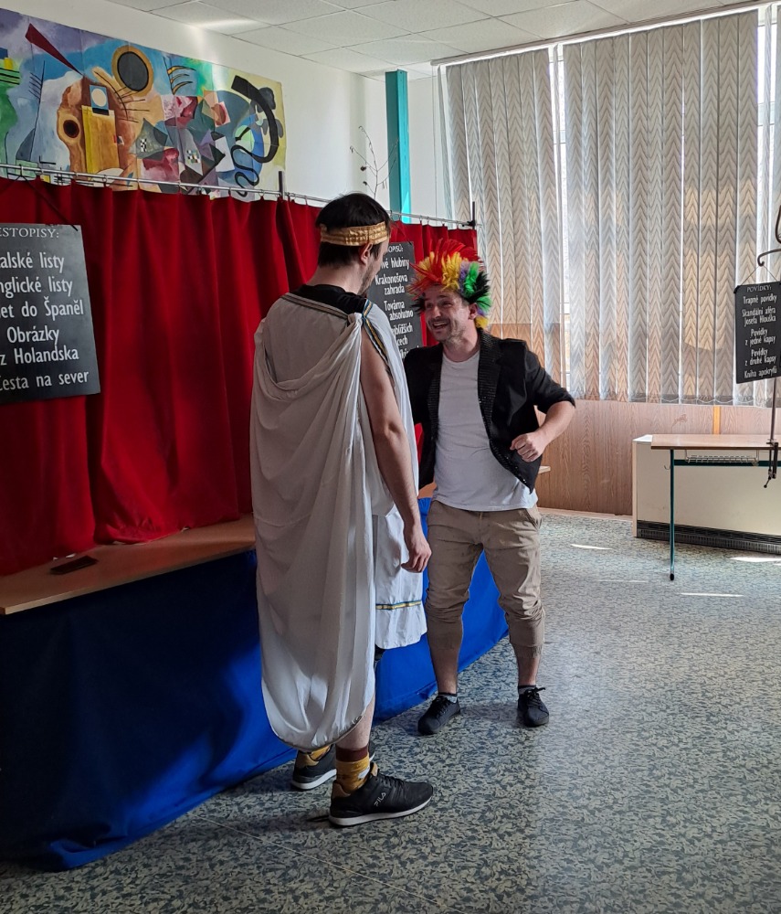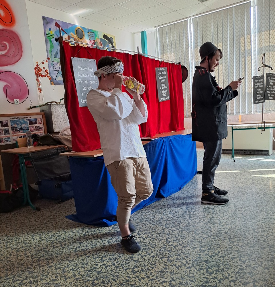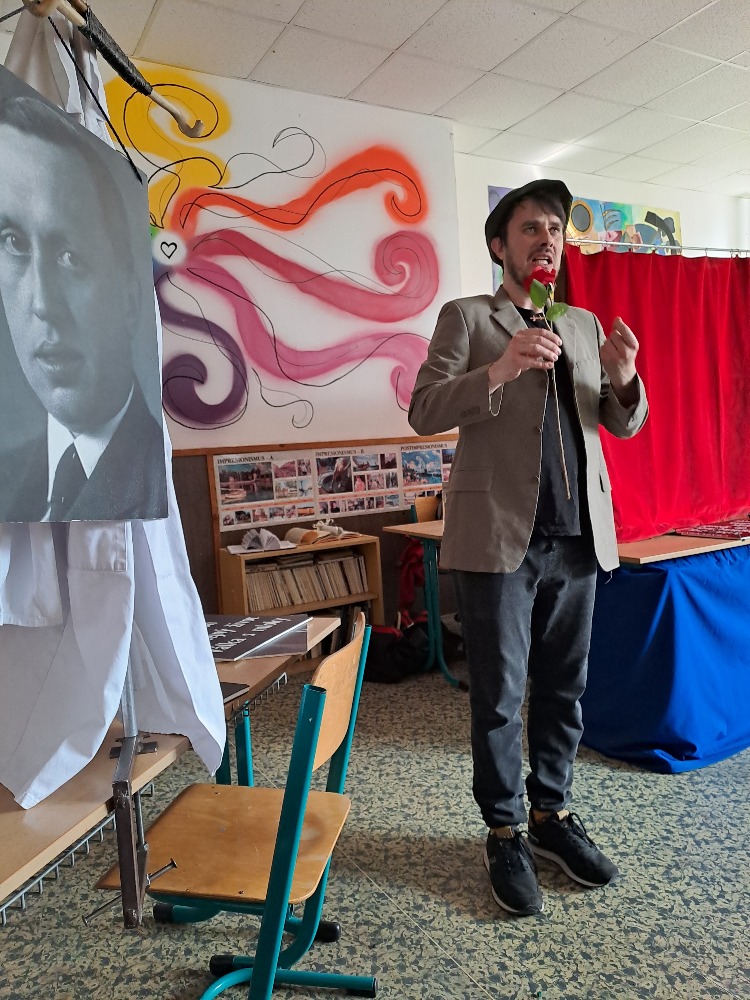 Ve čtvrtek 19.března navštívilo naše gymnázium opět po kratší pauze “Divadélko pro školy” z Hradce Králové. Tentokrát pro nás byl připraven program “Fenomén Karel Čapek”. Publikum (tercie a kvarta v rámci jednoho představení a kvinta, sexta a septima v rámci druhého) zhlédlo čtyři ukázky – scénky z divadelních her Loupežník, Bílá nemoc a Adam stvořitel a dramatizaci povídky Básník ze souboru Povídky z jedné kapsy. Jako vždy nás čekala vtipná vystoupení spojená s poučením o autorovi (dozvěděli jsme se spoustu informací nejen o Karlu Čapkovi, ale i o jeho bratru Josefovi); nechyběla spolupráce s publikem, důležitá byla tentokrát i závažnější témata k zamyšlení.