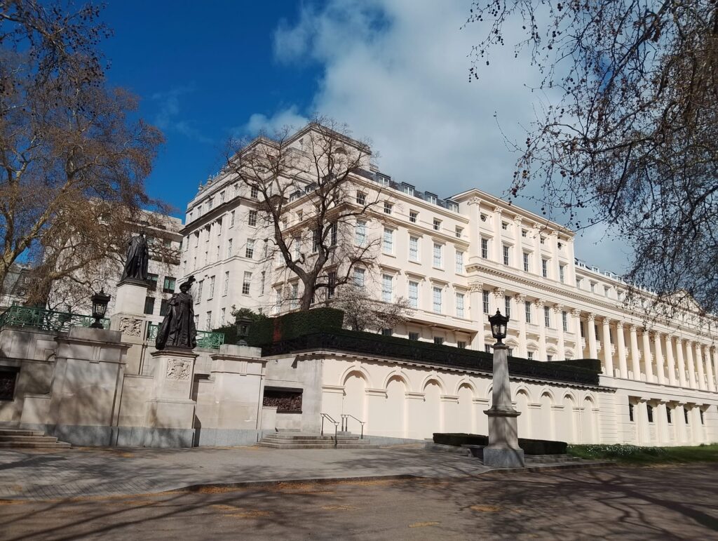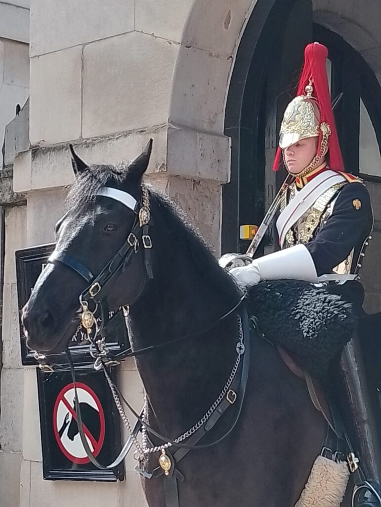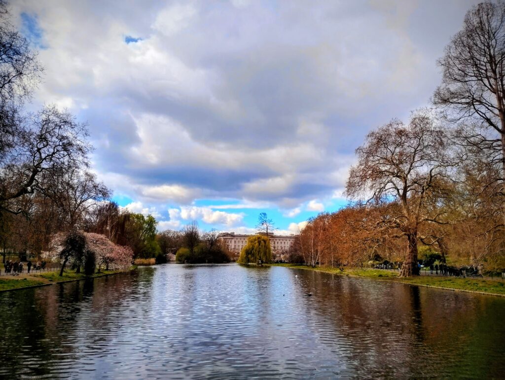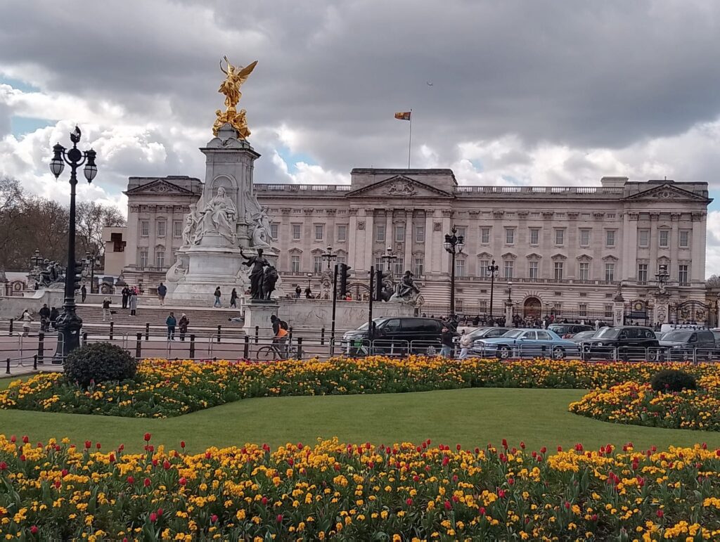 Naše pěší prohlídka pokračovala přes Downing Street, kde sídlí britský premiér, a dále přes krásné zahrady St. James’s Park. Podívali jsme se na Buckinghamský palác, kde pobývá král Charles III.